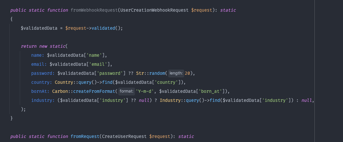 }It's a simple DTO class that holds data for user creation. We have got some string fields, a Carbon born date and 2 models, Country and Industry. Also note that industry can be null.